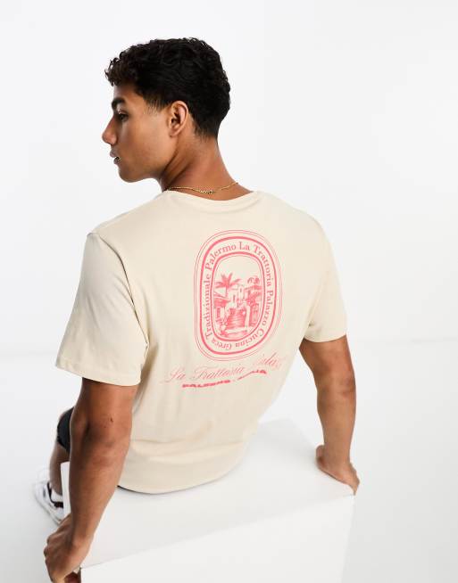 Selected Homme - Beige oversized t-shirt med italiensk print på ryggen