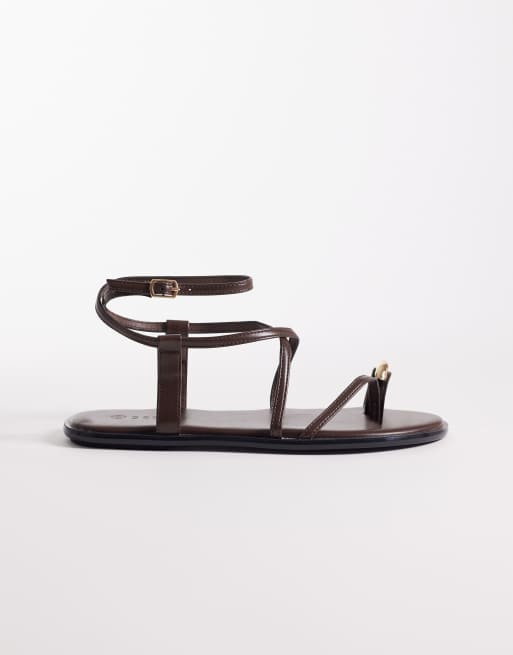 SEQWL Wide Fit - Brune flade sandaler med stropper og guldfarvet metaludsmykning
