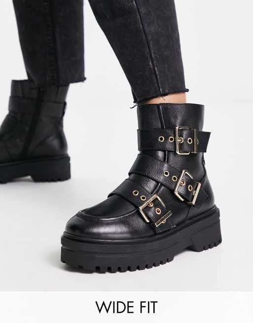 Simply Be Extra Wide Fit - Sorte flade ankelstøvler i læder med spænde