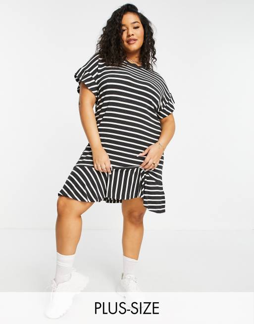 Simply Be - T-shirt-kjole i sorte og hvide striber med flæsekant