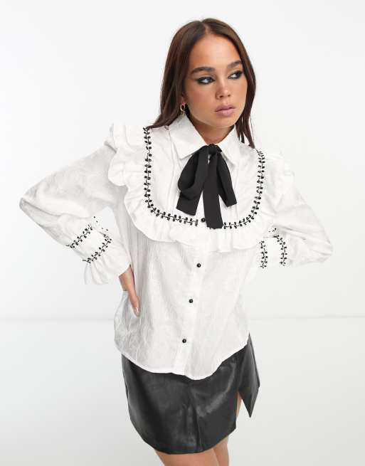 Sister Jane - Hvid bluse med flæser og sløjfe samt kontraststing