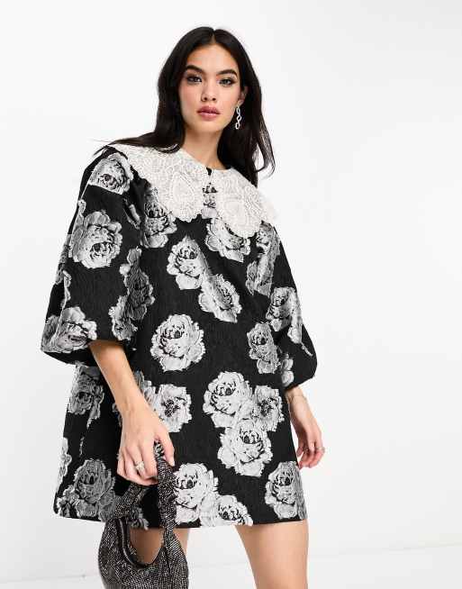 Sister Jane - Sort smock-kjole i jacquard i minilængde med oversized krave