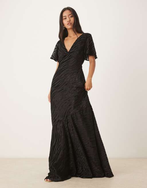 Six Stories - Sort maxikjole i devore med flagreærmer og v-hals samt sænket kant