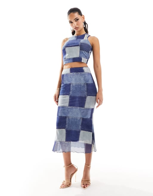 Sixth June - Blåt sæt med top og maxinederdel med patchwork-design i denim og mesh