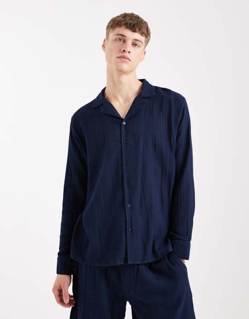 Sol Beach - Marineblå langærmet strandskjorte med vaffeltekstur - Del af sæt
