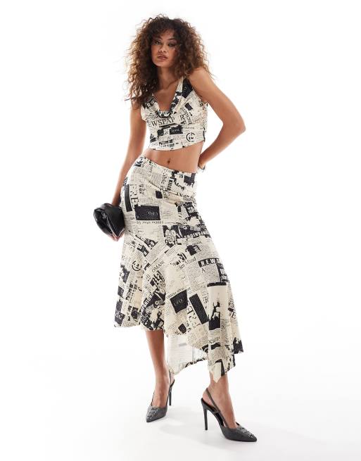 Something New - Midinederdel med tørklædekant og avisprint - Del af sæt