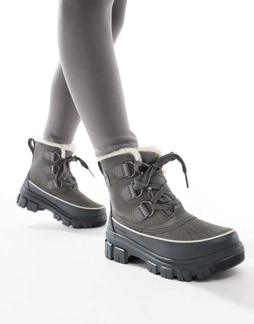 Sorel - Torino V WP - Vandtætte og mørkegrå snestøvler i læder med imiteret pelsfor