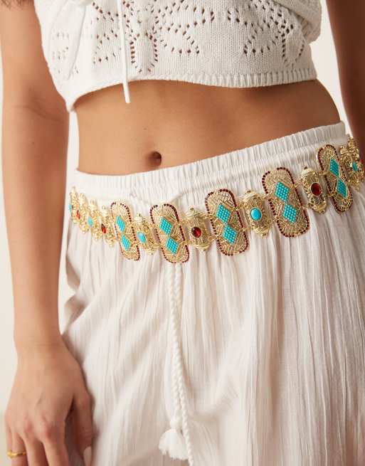 South Beach - Guldfarvet bælte med medaljondesign med turkise sten