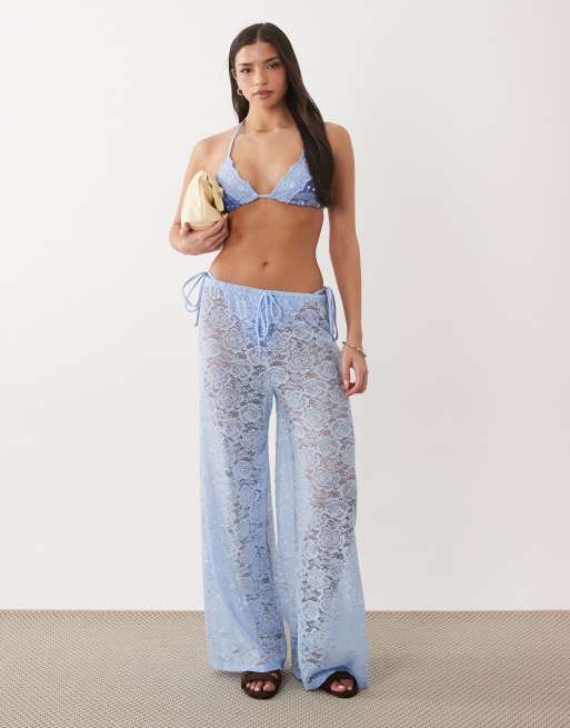 South Beach - Lyseblå bukser med brede ben i blondestof
