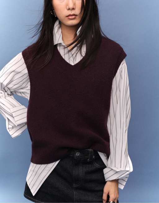 Stradivarius - Auberginefarvet vest i blød strik med V-hals