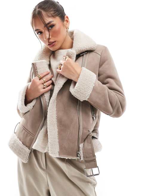 Stradivarius - Beige bikerjakker med for i imiteret lammeskind