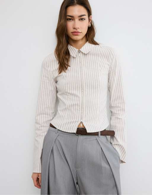 Stradivarius - Beige figursyet skjorte i bengalin med dobbelt lynlås