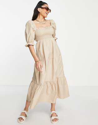 Stradivarius - Beige rynket midikjole i poplin med pufærmer