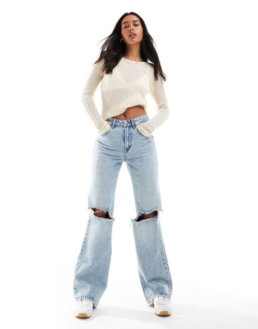 Stradivarius - Blå dad-jeans med vide ben og flænger