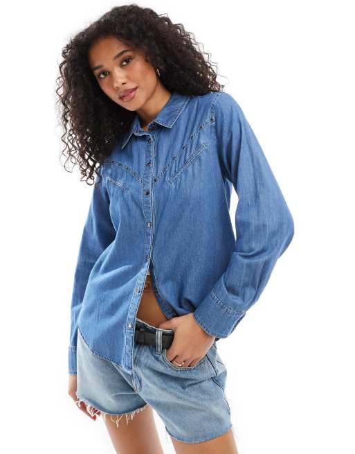 Stradivarius - Blå denimskjorte med nittedetaljer