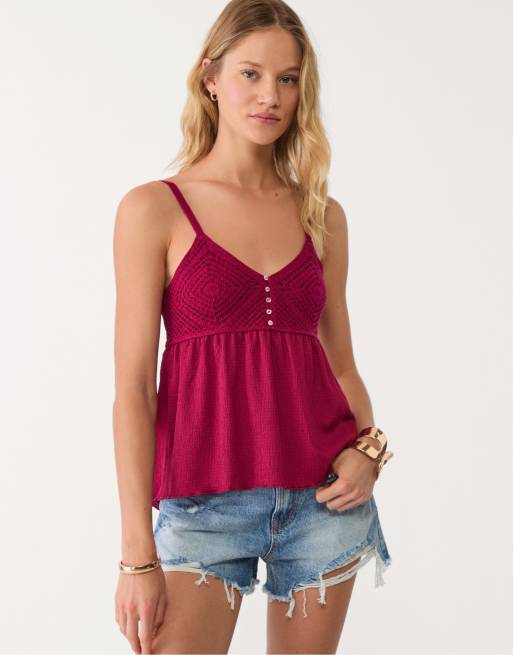 Stradivarius - Bordeaux top med hæklet look og flæser