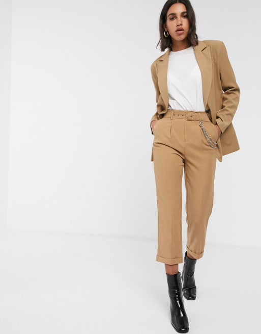 Stradivarius - Boyfriend - Camel-farvet blazer & bukser med kæde detalje