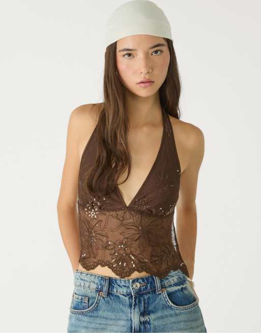 Stradivarius - Brun halterneck-top med pailletbroderi