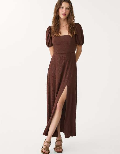 Stradivarius - Brun milkmaid-maxikjole med tekstur og krydsryg