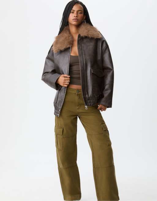 Stradivarius - Brun oversized jakke med kontrasterende krave i læderlook