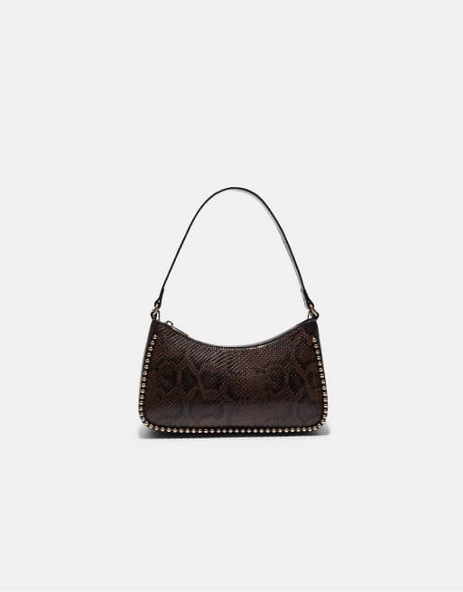 Stradivarius - Brun skuldertaske med lædereffekt og dyreprint samt perler