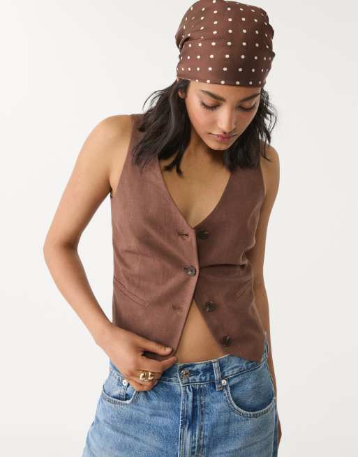 Stradivarius - Brun vest med knapper i hørblanding