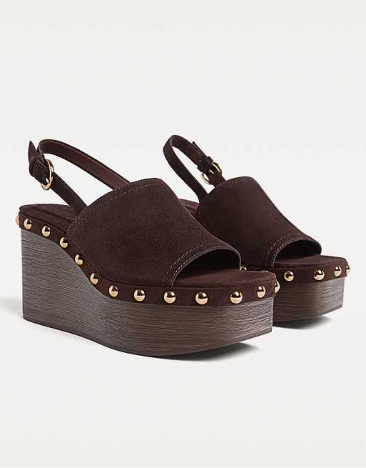 Stradivarius - Brune plateau-sko med kilehæl og nitter i læder
