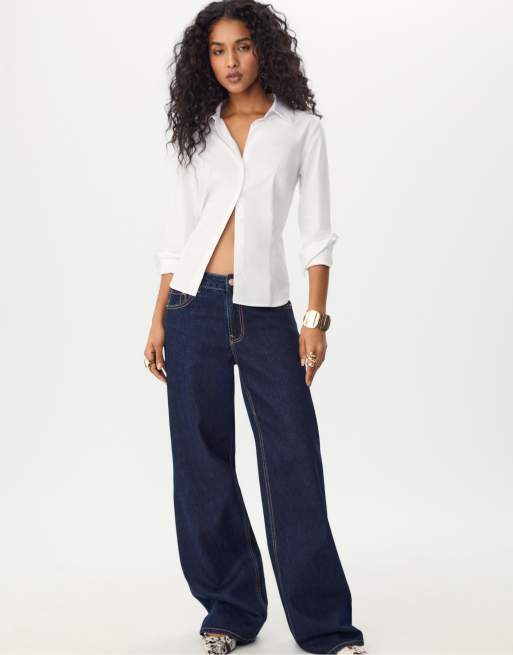Stradivarius - D91 - Lavtaljede og overfarvede blå jeans med brede ben