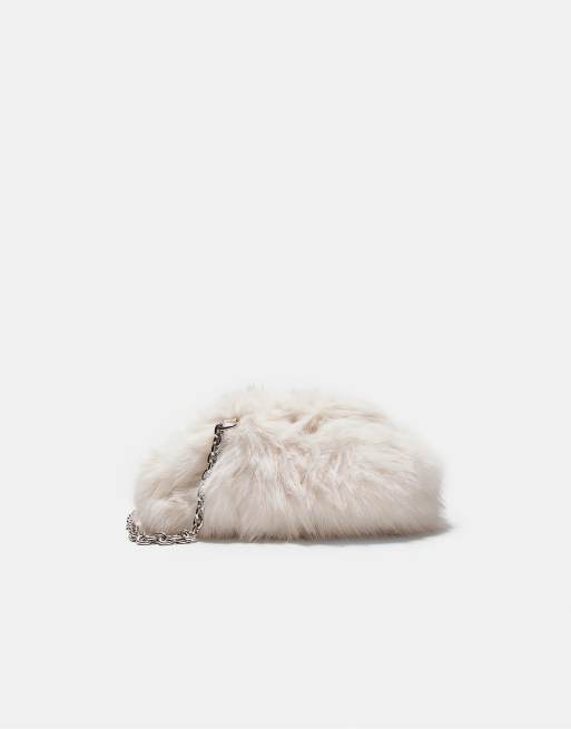 Stradivarius - Ecrufarvet bucket-taske med kæde i imiteret pels