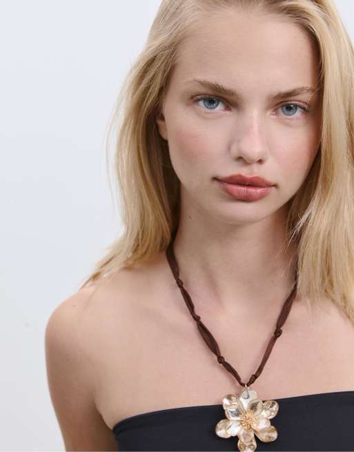 Stradivarius - Ecrufarvet halskæde med snor og blomstervedhæng