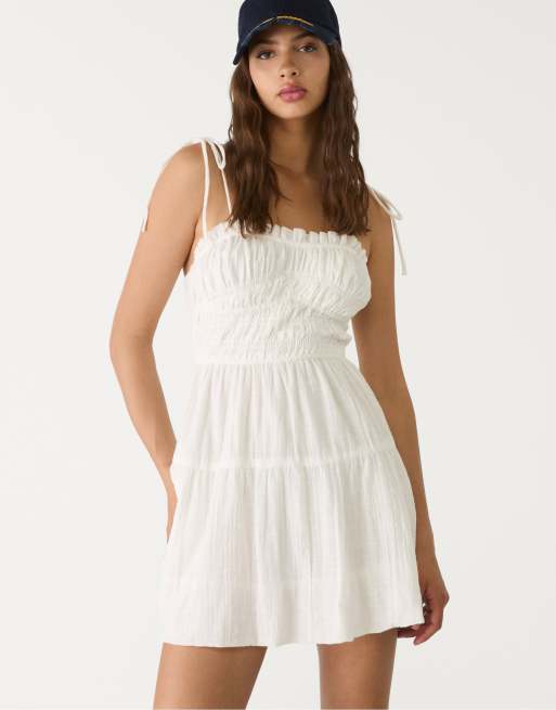 Stradivarius - Ecrufarvet kort ballonkjole med elastisk livstykke
