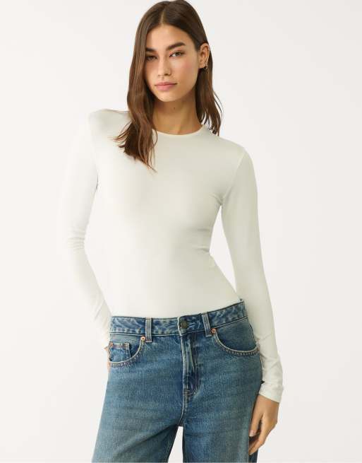 Stradivarius - Ecrufarvet langærmet bodystocking i polyamid