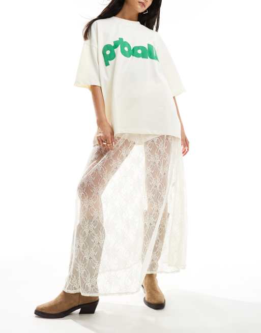 Stradivarius - Ecrufarvet maxinederdel i blondemateriale