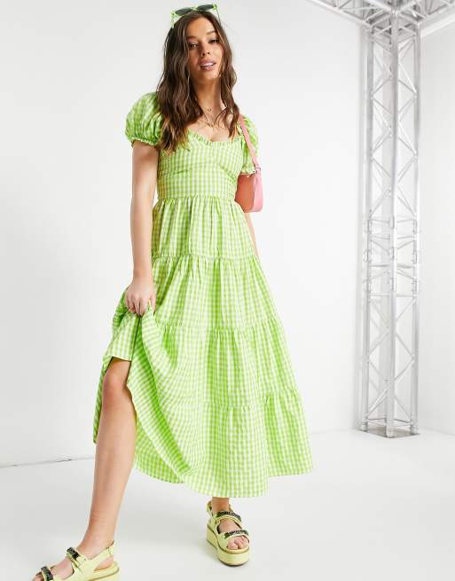 Stradivarius - Grøn milkmaid-kjole med pufærmer og grønne gingham-tern i poplin