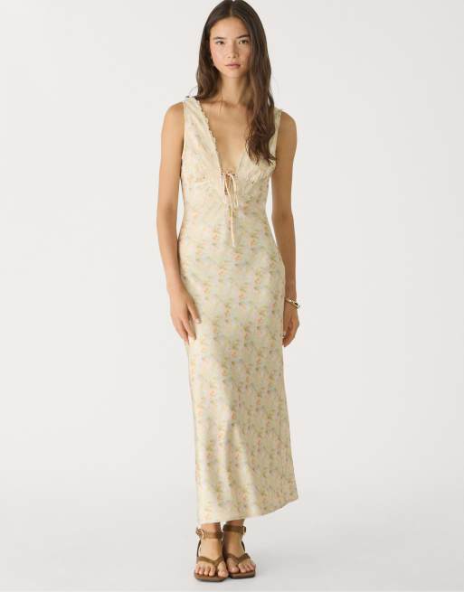 Stradivarius - Guldfarvet midikjole i satin og blondestof