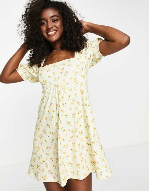 Stradivarius - Hvid minikjole med firkantet hals og blomstermønster