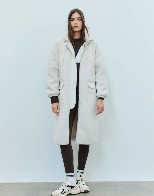 Stradivarius - Lang vaniljefarvet frakke med imiteret lammeskindsfor