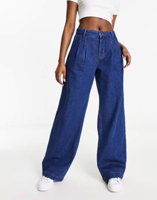 Stradivarius - Mørkeblå jeans med vide ben og indsyede detaljer