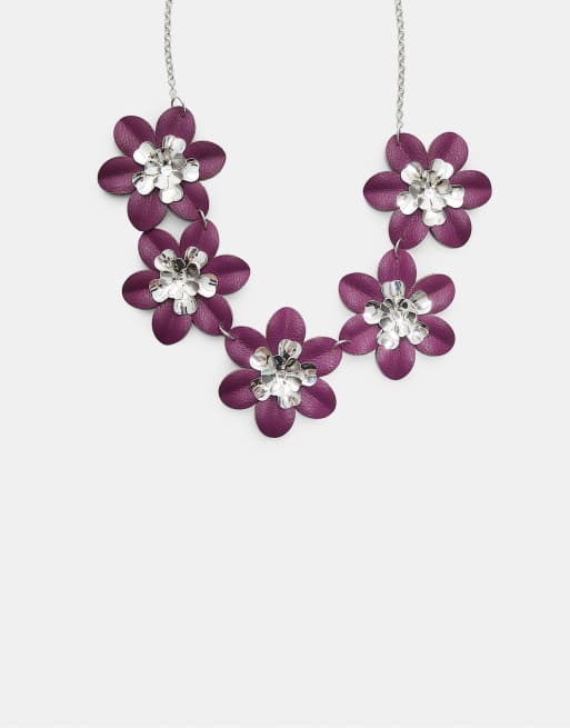 Stradivarius - Mørkelilla halskæde med blomster i lædereffekt med kontrastfarvede detaljer