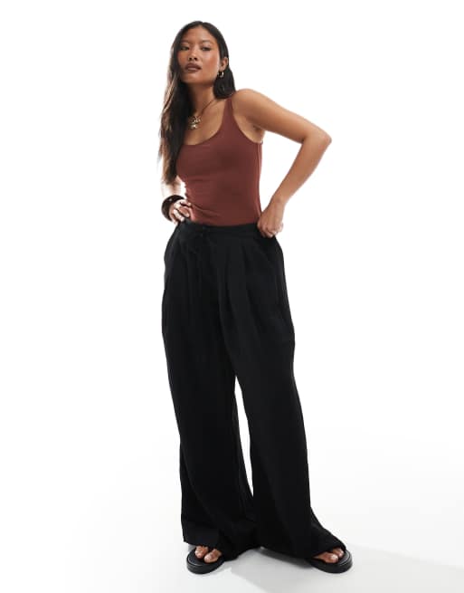 Stradivarius Petite - Sorte bukser med vide ben og bindebånd i taljen i krølstof