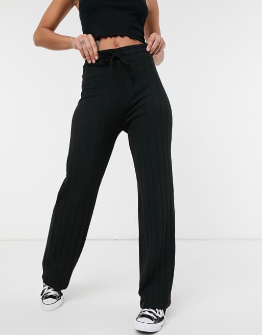Stradivarius - Ribstrikkede bukser med vide ben i sort polyester