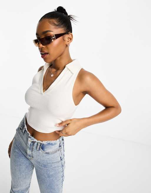 Stradivarius - Ribstrikket polo uden ærmer i hvid
