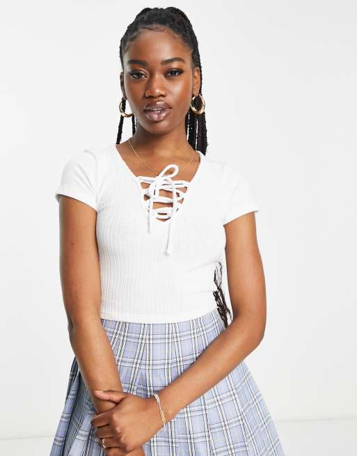 Stradivarius - Ribstrikket råhvid T-shirt med snører