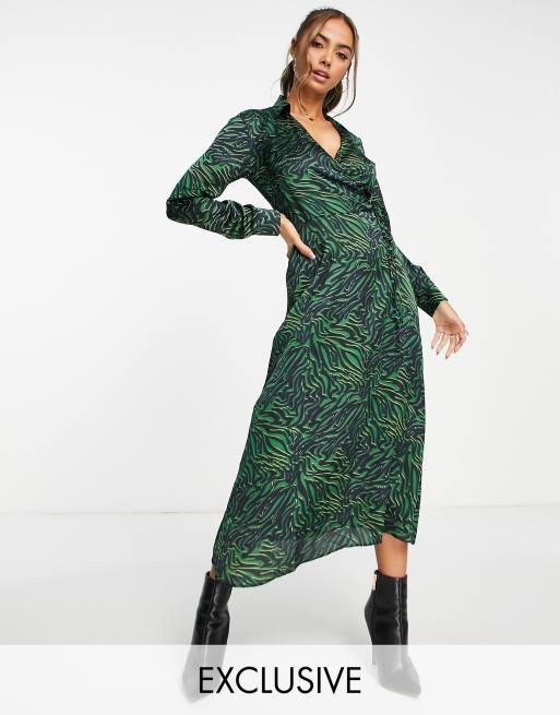 Stradivarius - Slå om-midikjole i satin med abstrakt grønt dyreprint