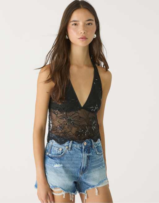 Stradivarius - Sort halterneck-top med pailletbroderi