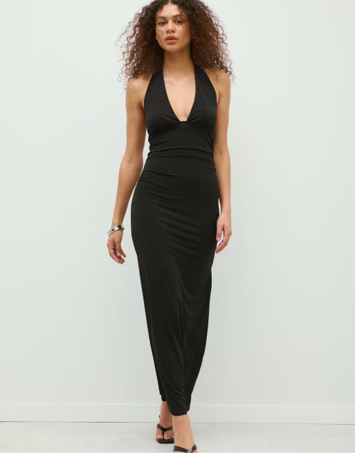 Stradivarius - Sort midikjole med halterneck og åben ryg