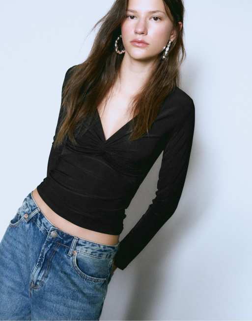 Stradivarius - Sort T-shirt med knudedetalje i halsen