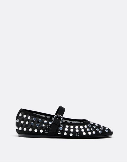 Stradivarius - Sorte ballerinaer med nitter i mesh