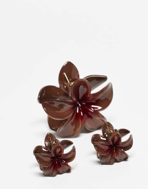 Stradivarius - Sæt med 3 brune hårklemmer med blomsterdesign