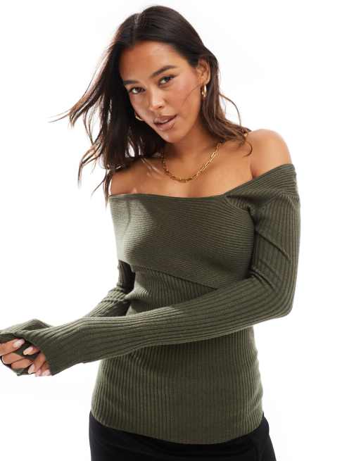 Style Cheat - Kakigrøn bardottop i ribstrik med asymmetrisk snit